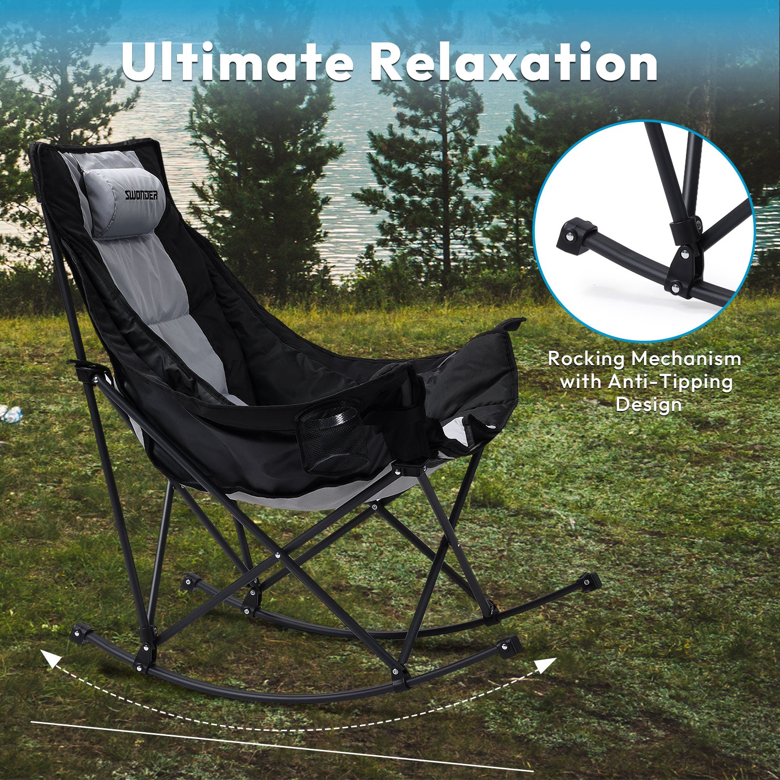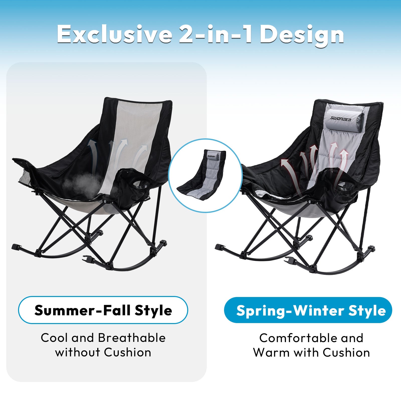 - ⛺Innovative 2-in-1 Design: Swonder camping chair features an exclusive 2-in-1 detachable padded seat cushion that allows you to enjoy cool, breathable mesh in the summer and warm, cozy padding in the winter. You can easily secure or remove the cushion using the side velcro straps and the top cover, making this rocking chair tailor your comfort to the season with ease.