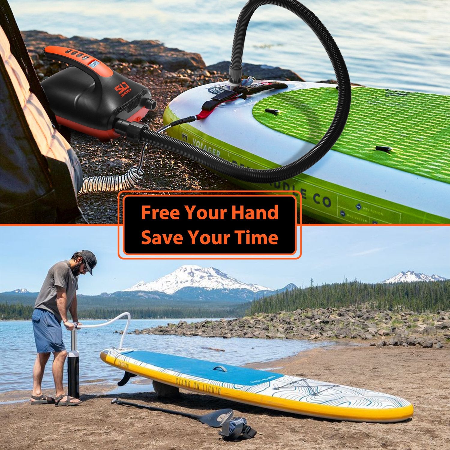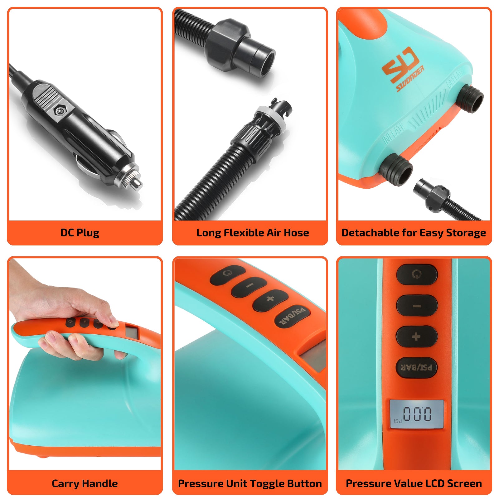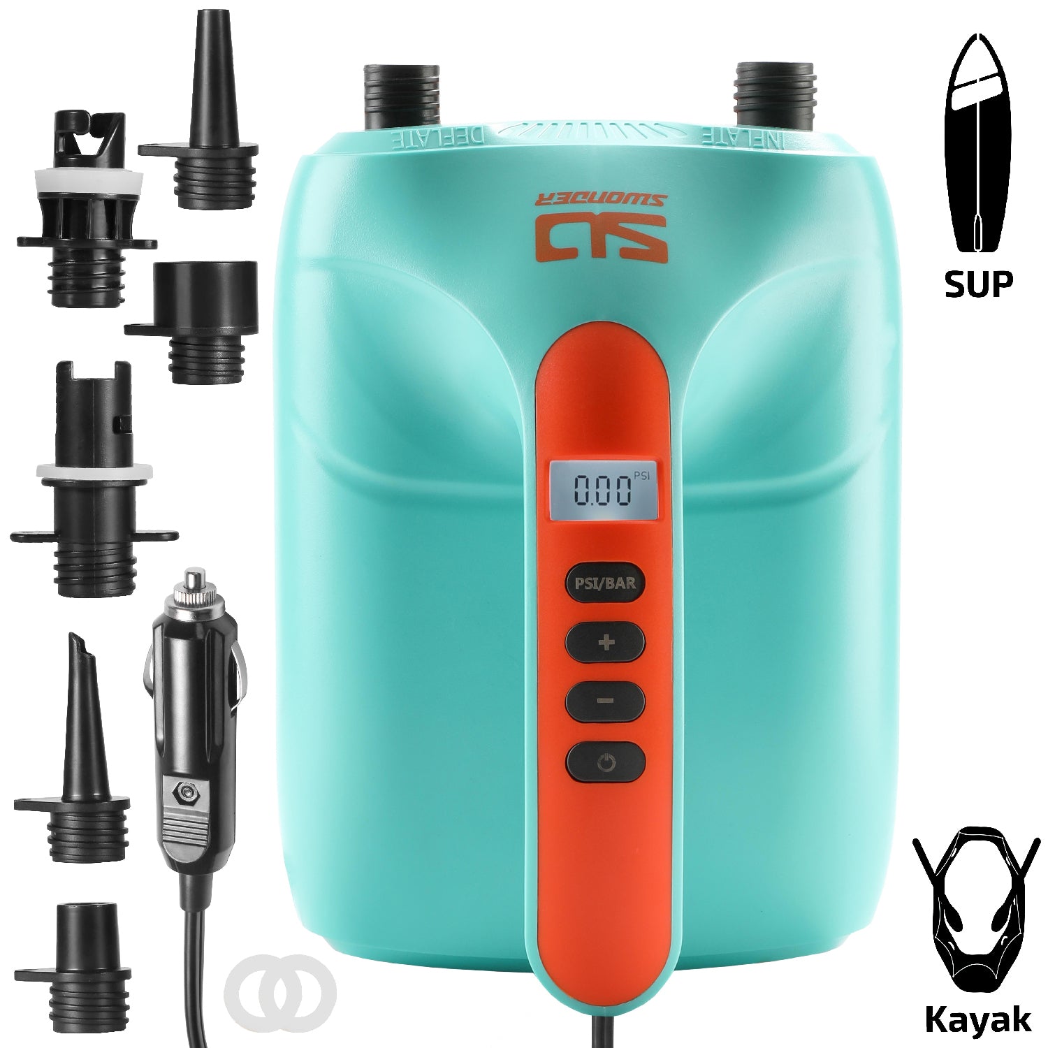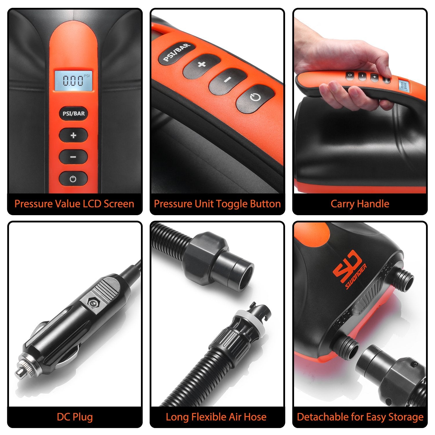 Swonder Electric Air Pump features an intelligent digital controller for dual-stage inflation and LCD display, with this powerful air pump you can inflate your water sports equipment easily and enjoy your ocean trip.