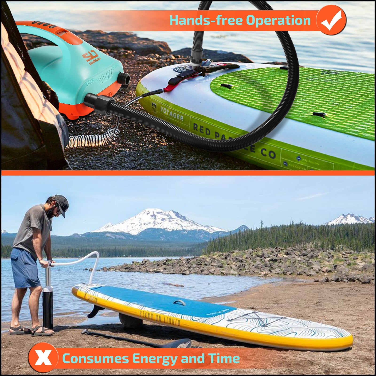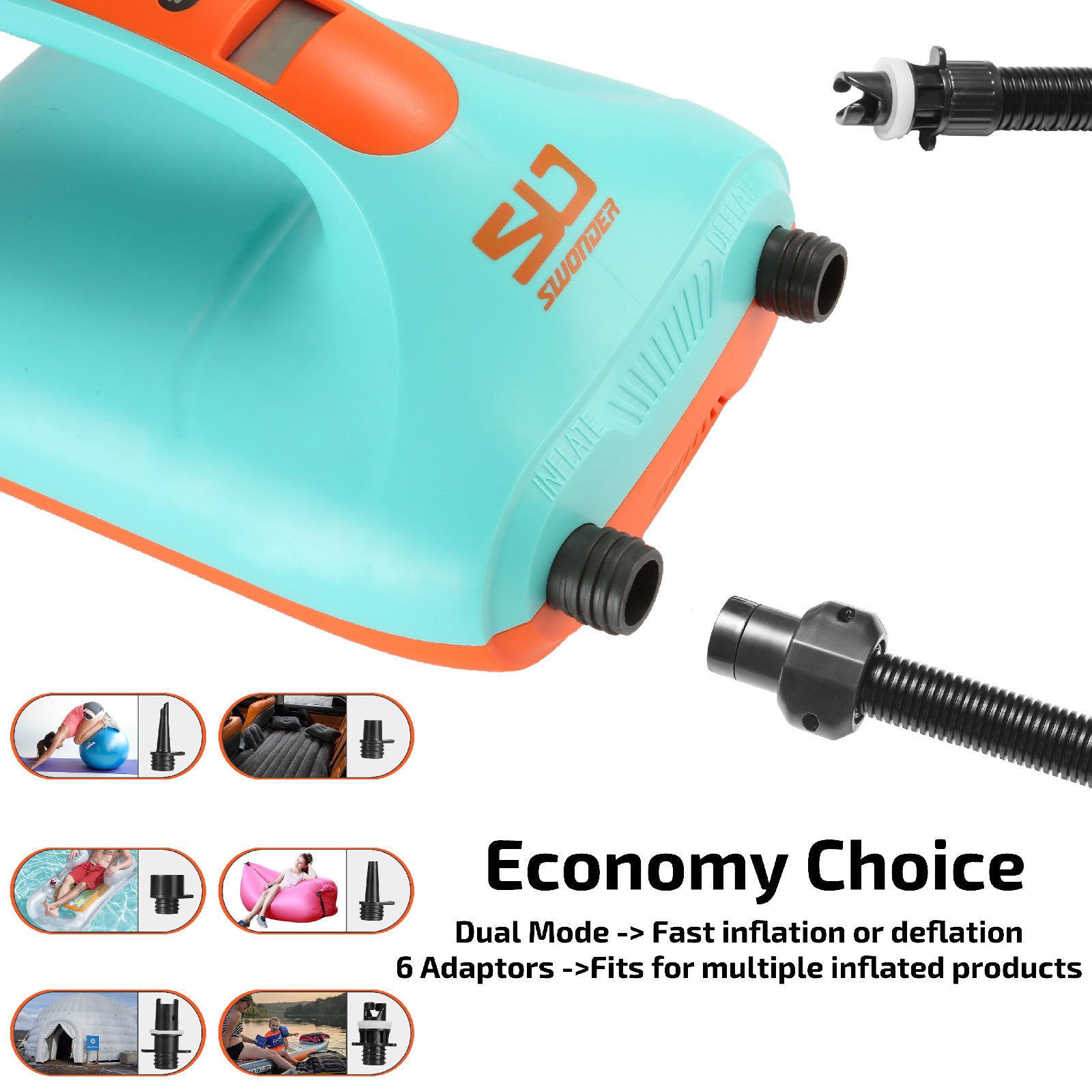 Different from most electric air pump compressor, Swonder Electric Air Pump can not only satisfy the needs of inflation for water sports but also can meet the needs of deflation for storage.